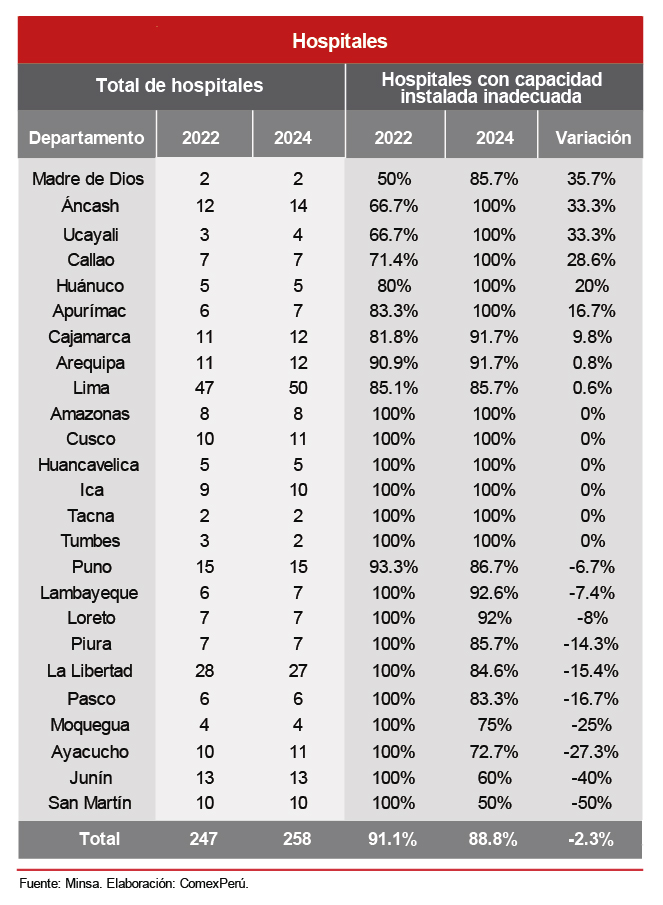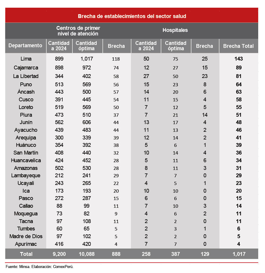 En agosto de 2025, el Ministerio de Salud (Minsa) publicó la actualización del Diagnóstico de Brechas de Infraestructura o Acceso a Servicios del Sector Salud de cara a la elaboración de la Programación Multianual Inversiones para el período 2027-2029. En el informe se observan avances en la construcción de hospitales y centros de atención, aunque persisten retos para cubrir a toda la población, así como de dotar a los establecimientos ya existentes de capacidad adecuada para contribuir a que su impacto sea efectivo.