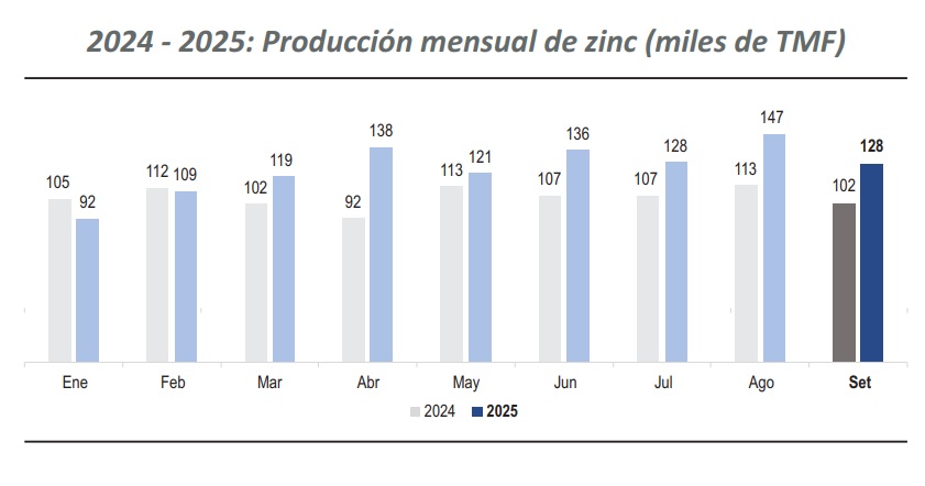 La producción nacional de zinc, en septiembre, alcanzó un total de 127,555 toneladas métricas finas (TMF), lo que representó un incremento de 25.5% con respecto al mes equivalente del año anterior (101,660 TMF).
