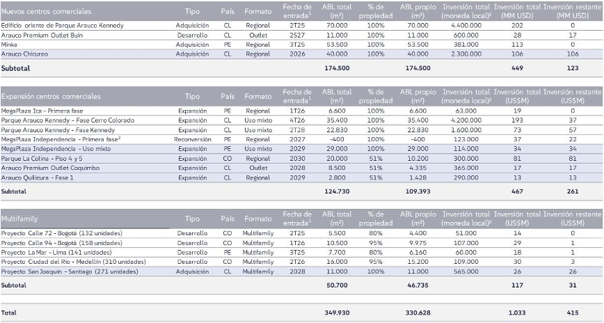 - Adquisición de Arauco Chicureo: Ubicado en la comuna de Colina, Santiago, este proyecto de 40.000 m² de ABL que representa una inversión de US$ 106 millones, contará con un mix comercial integral encabezado por una tienda de mejoramiento del hogar bajo la marca Homecenter Sodimac y un supermercado Líder, proyectando su apertura para el segundo semestre de 2026.